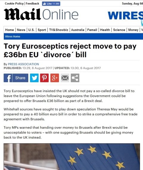 Brexiteers obviously see this as a political liability because they immediately started denouncing it as an outrage. ‘Tory Eurosceptics reject move to pay £36bn EU `divorce´ bill’ ran a Mail Online headline on 6 August. Arch Brexit campaigner, Conservative MP Peter Bone even claimed that the EU should be paying the UK, not the other way around.