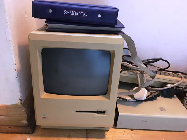 My old mended Mac, recently rescued from the loft in order to amuse young visitors. We tried plugging it in. A lot of smoke emerged from the back. It smelt strangely organic: a mouse nest maybe?. Then with a loud ping and a small flash, it finally died for a second time. Electrowaste I guess.