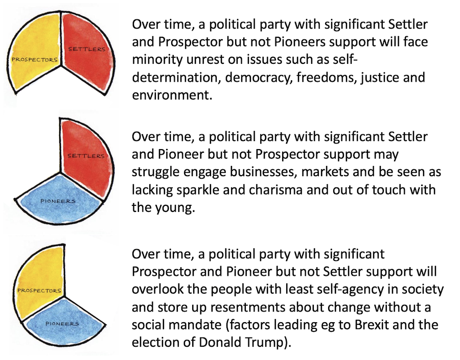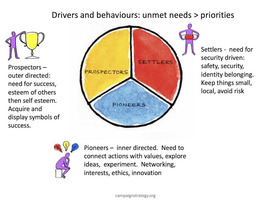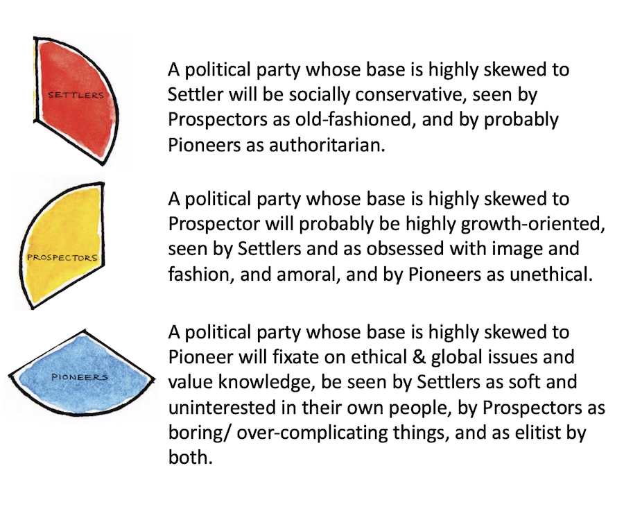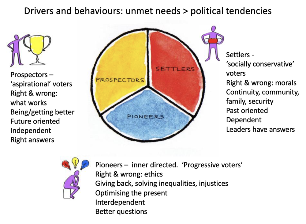 Non-political schematic of values map: Settlers have an unmet need for safety, security and identity; Prospectors for esteem of others then self-esteem; Pioneers for ethical-clarity, then self-expression and practical ethics, integration and self-actualization. (Maslow Groups).