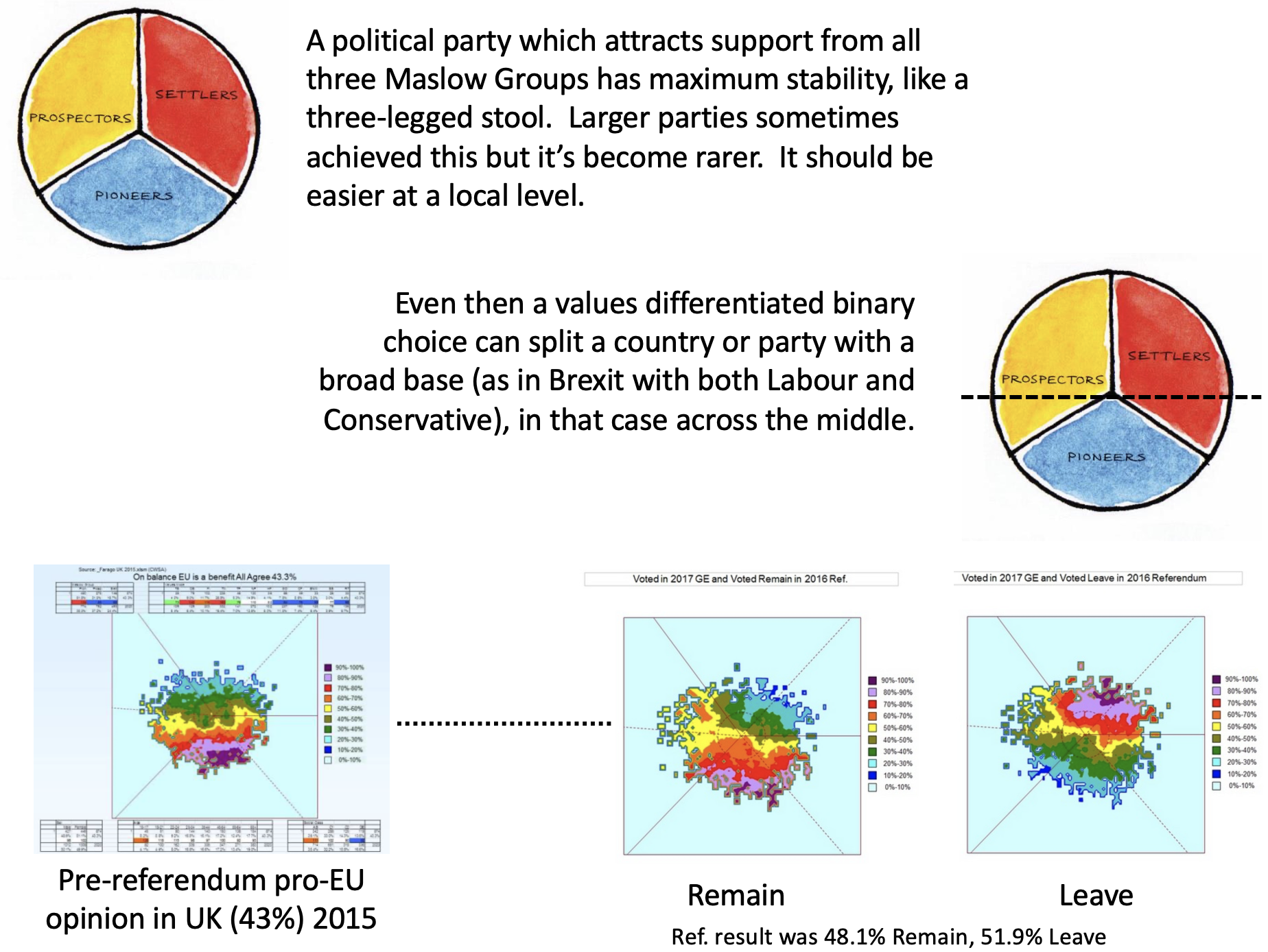 - Decades in which post-industrial (service/ knowledge) opportunities went disproportionately to the educated, who also became more able to meet their needs for safety, security and belonging (in CDSM Maslowian terms Settlers), and then Prospector needs (seeking esteem of others and then self-esteem), becoming Pioneers (now the core vote for example of the UK Labour Party), most of them ‘progressives’. (L/R divides> values divides & a University education/not divide, identified by pollsters)