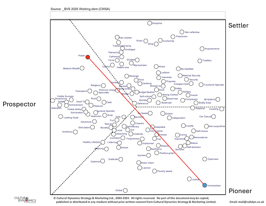 from Pat Dade of Cultural Dynamics Strategy & Marketing showing Power v Universalism, the commonest polarization axis in western politics