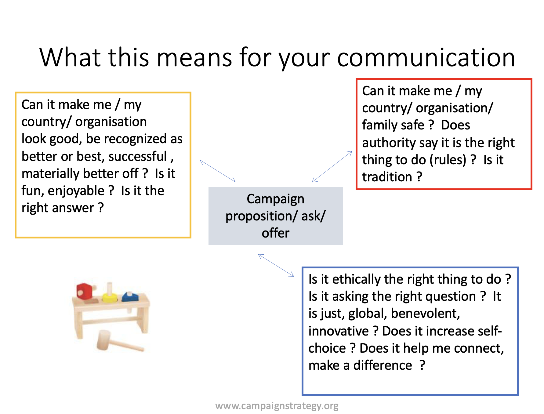 Non-political: some of the sorts of questions different Maslow groups ask of a proposition.