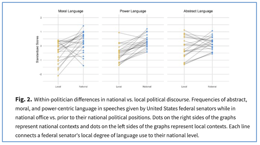 ‘Unlike local politics, which can rely on shared concrete knowledge about the region, national politics must coordinate large groups of people with little in common. To provide this coordination, we find that national-level political discussions rely upon different themes than local-level discussions, using more abstract, moralized, and power-centric language. The higher prevalence of abstract, moralized, and power-centric language in national vs. local politics was found in political speeches, politician Tweets, and Reddit discussions. These national-level linguistic features lead to broader engagement with political messages, but they also foster more anger and negativity’.