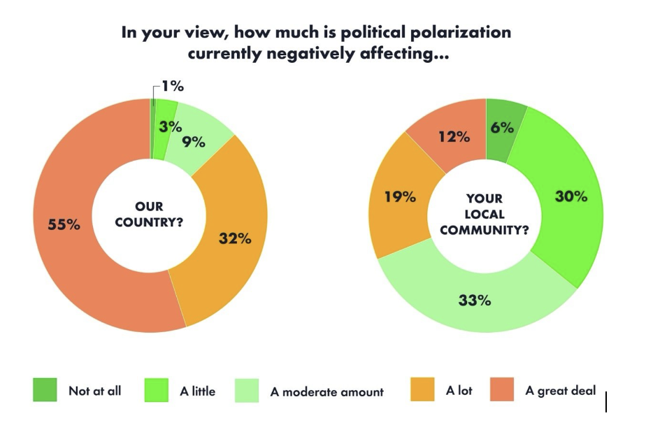 A local-up rather than top-down approach could build on the existing greater tolerance of differences at a local level. Another 2024 US study, by Civic Pulse/Carnegie found from surveying over 1,400 elected politicians and officials in local government that ‘an overwhelming majority of local government leaders (87 percent) believes polarization is hurting the country but far fewer (31 percent) see negative effects in their own communities’. They concluded that (while not without its problems detailed in the study):