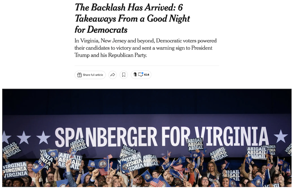 Right now there must be a huge temptation for Democrats not to think about it. If the pendulum swings against the Republicans it might not, Electoral College aside, take a huge shift in national political sentiment to return a Democratic President – Trump beat Harris by only 49.8% to 48.3%. Polls in New Jersey and Virginia found that previous Trump supporters switching to Democrats Mikie Sherrill and Abigail Spanberger played a bigger role last Tuesday than turnout effects. Almost all politicians decry the effects of polarization but they may be inclined to forget about it when it works to their benefit.